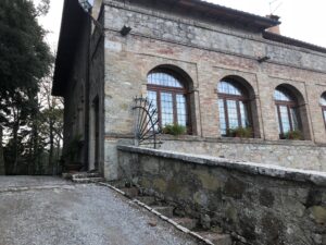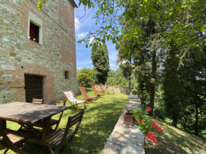 Il Poderino is a renovated farmhouse with breathtaking views. It was formerly the stables of the estate. A 10 minute walk down a private road just below the main hamlet, it has a large living room with open fireplace, kitchen, laundry room, and spacious dining room with open fireplace. Two bedrooms with ensuite bathrooms on the lower floor face the garden and 2 bedrooms with ensuite bathrooms on the main floor have windows onto the countryside.