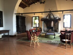 - Spacious reception room with fireplace, comfortable antique furniture, and stunning views of the countryside.