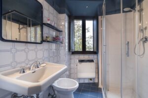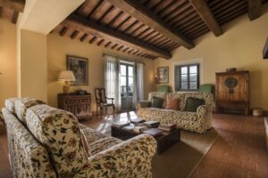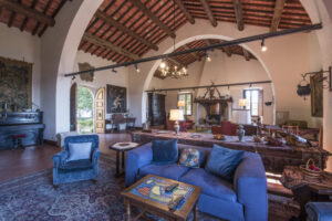 Le Capanne has 5 bedrooms and 5 bathrooms on 3 floors with a bright kitchen, a large sitting area with fireplace, smaller upstairs reading area also with fireplace, and dining room with French doors onto a private garden. Situated down the hill from the hamlet, a lovely 15 minute walk with sweeping views brings you to the main estate.